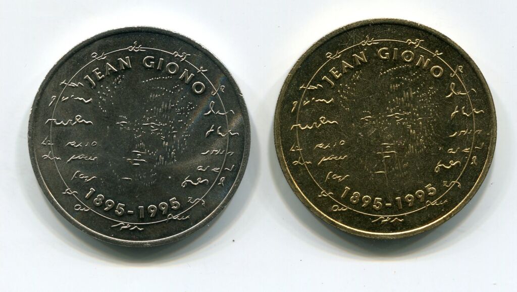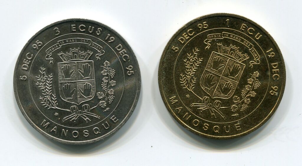 FRANCE - PRECURSEURS MONNAIE EUROPEENNE " écus des villes " MONNAIES TEMPORAIRES " - ECUS de MANOSQUE (04), série de 2 monnaies de 1 écu laiton + 3 écu nickel, blason de ville à l'avers, Portrait de Jean Giono au revers - LES DEUX SUP.