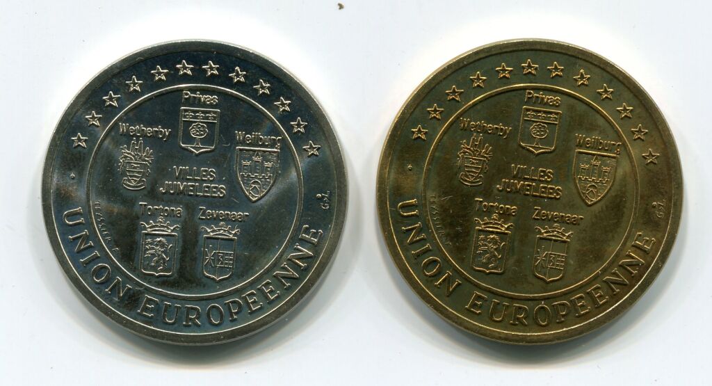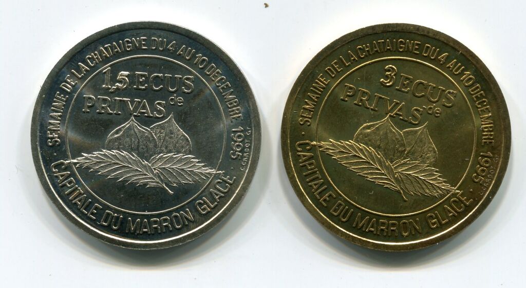 FRANCE - PRECURSEURS MONNAIE EUROPEENNE " écus des villes " MONNAIES TEMPORAIRES " - ECUS DE PRIVAS (07), " UNION EUROPEENNE " - " CAPITALE du MARRON GLACE "série de 2 monnaies de 1,5 écu " châtaignes " en nickel + 3 écu idem en laiton - à l'avers blasons des villes jumelées avec Privas - LES DEUX SUP.
