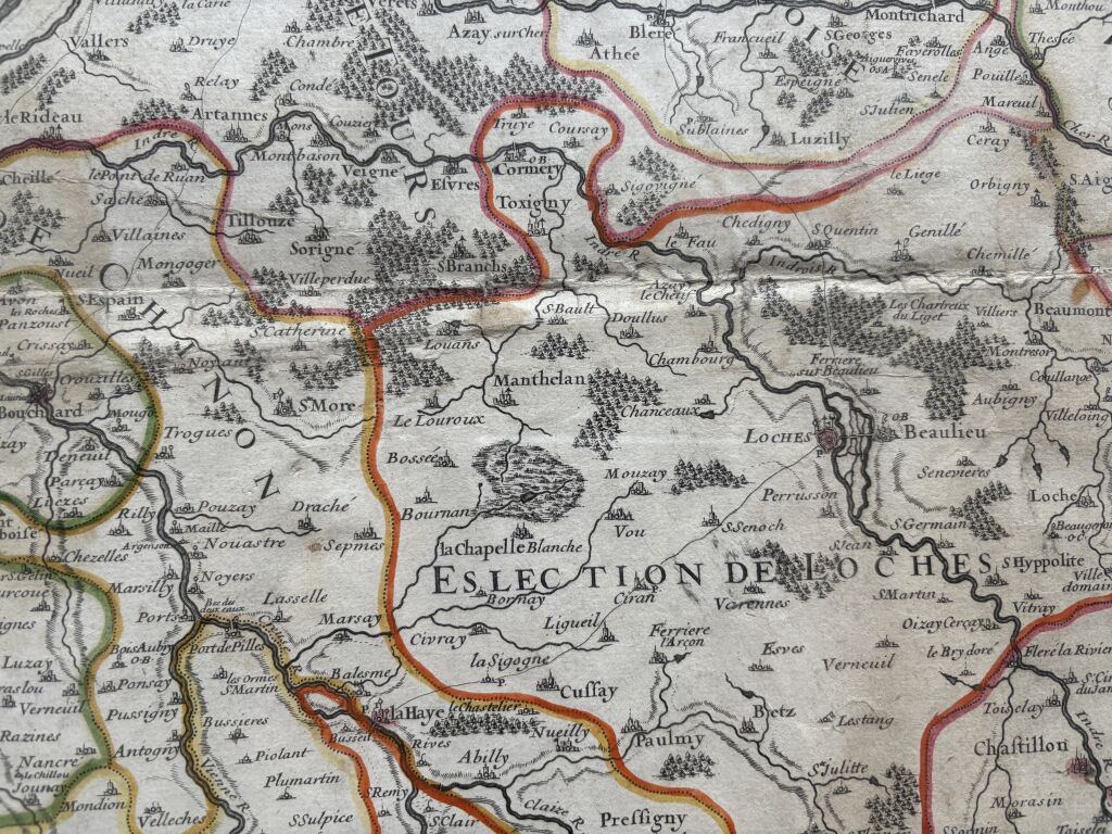 grande CARTE GEOGRAPHIQUE MURALE début 18e siècle " LES ESLECTIONS de TOURS, d' AMBOISE, DE LOCHES, de RICHELIEU, de LOUDUN, de CHINON, de BAUGE, de SAUMUR, de MONTREUIL BELLAY et d' ANGERS dans la GENERALITE de TOURS, 1711, dressée par le Sieur JAILLOT ( * ), géographe ordinaire du Roy, joignant les Grands Augustins, aux 2 globes avec privilège de sa majesté ". - Belle gravure taille douce sur cuivre colorisée. Format 54 x 77 cm.