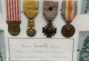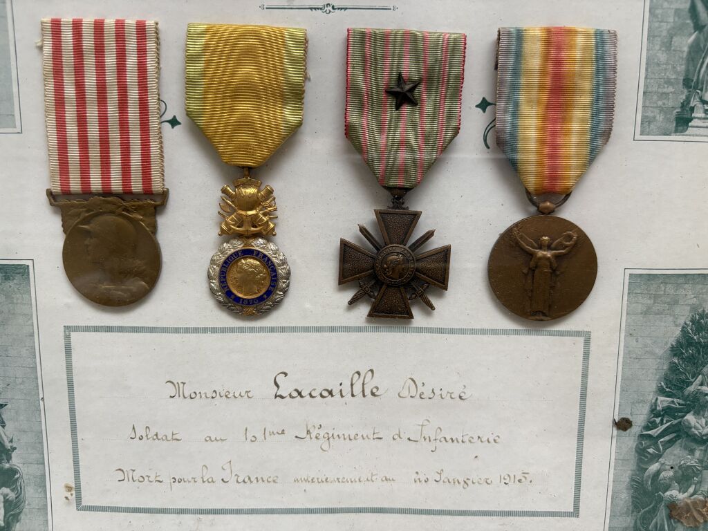 Cadre sous verre moulures bois contenant ses 4 décorations : commémorative 1914-1918, MEDAILLE MILITAIRE, CROIX de GUERRE avec étoile, médaille Interalliée de Morlon.