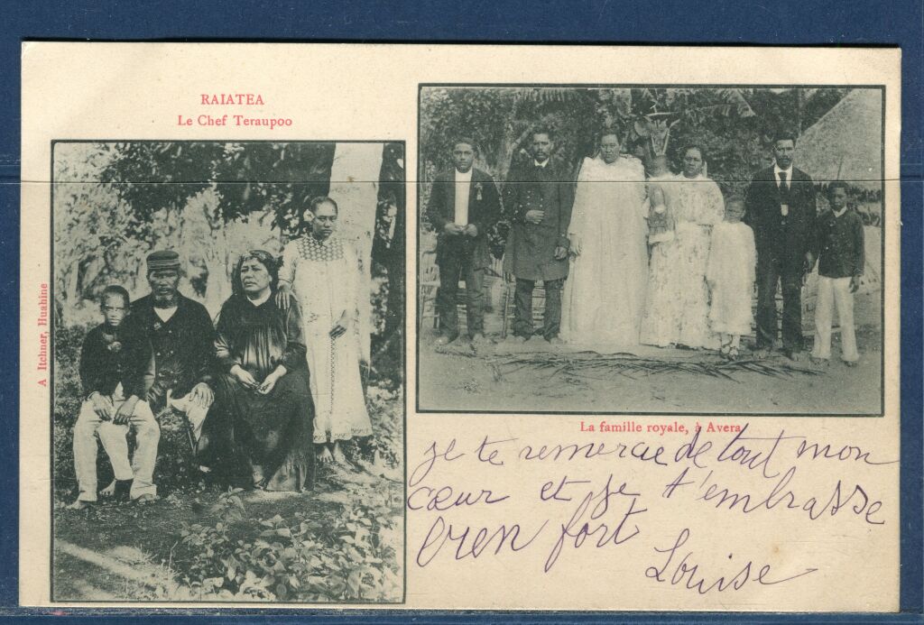 ILES SOUS LE VENT (...de Tahiti, Polynésie Française) - "RAIATEA le Chef TERAUPOO" et " LA FAMILLE ROYALE à AVERA " - carte postale 2 vues photos signées A. ITCHNER à Huahine, dos non divisé édition avant 1904.
