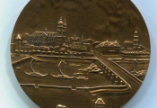 Armes de Tours couronnées mention 1833 - 1983. Revers : entrée de ville depuis les coteaux de St Cyr au 19e siècle. La Loire et la navigation fluviale, la cathédrale, St Julien,....