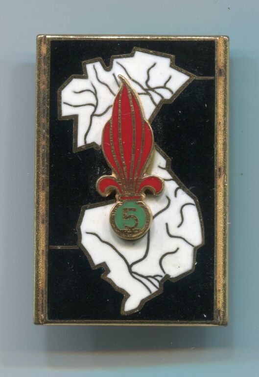 MILITARIA - INSIGNE REGIMENTAIRE LEGION ETRANGERE - 5e Rgt étranger d'infanterie - émail grand feu, grenade rajoutée rouge sur carte de l'Indochine. Fabrication GRAGO PARIS, inscription en bas, épingle sur pastille simple allongée.