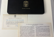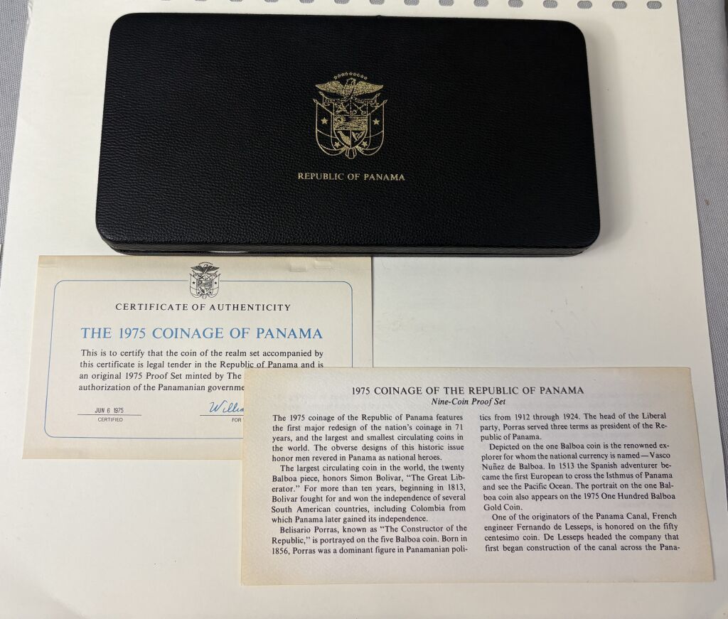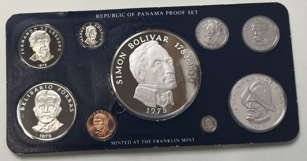 PANAMA 1975 - spectaculaire collection de neuf monnaies, série historique pour " honorer les hommes considérés au Panama comme des héros " : de la 1 centime à la spectaculaire pièce de 20 Balboa : la un centime en cuivre célèbre le chef indien Urraca qui résista à la conquête espagnole, la 50c en 2ickel le français Ferdinand de Lesseps constructeur du Canal, la 1 Balboa de 38 mm EN ARGENT 925 millièmes ( 26,73 grammes )Vasco Nunez de Balboa 1er européen " espagnol aventurier " à découvrir le pays, la 5 balboa en argent également (35,12 grammes), la spectaculaire 20 balboa honore Siùon Bolivar " le grand libérateur " ( diamètre 61 mm pour un poids d'argent 1er titre de 129,59 grammes !).
