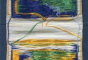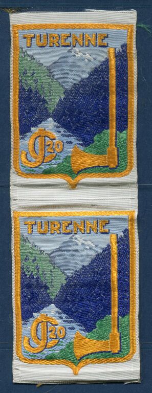 Insigne titre d'épaule soie brodée couleurs illustration torrent dans une vallée boisée, montagne au fond - 65 x 47 mm -