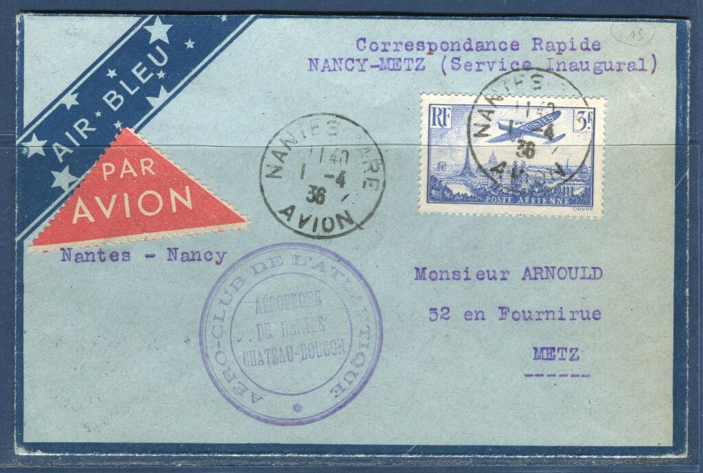 Porte étiquette triangulaire rouge PAR AVION + cachet de l'AERO CLUB de l'ATLANTIQUE, aérodrome de Nantes Chateau Dougon - Cachet à date départ NANTES GARE AVION 1er avril - au dos : cachet d'arrivée METZ R.P. même jour. - Muller n° 74.