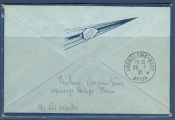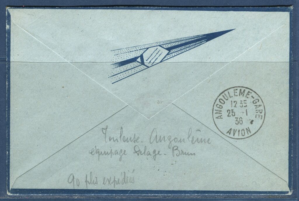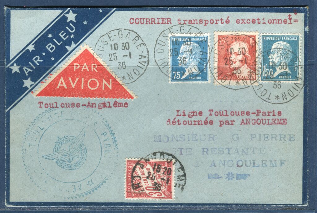 25 janvier 1936 - VOL D ' ESSAI TOULOUSE à ANGOULEME - Transport exceptionnel du courrier par avion à partir du vol de la ligne Toulouse à Paris détourné par Angoulême - Pli enveloppe officielle d' AIR BLEU, papier bleu avec décors et logo de la Cie - Porte étiquette triangulaire PAR AVION + cachet de l'Aero club de Toulouse - cachet à date départ TOULOUSE GARE AVION - Affranchissement à 3 f : 75c type Pasteur n° 177 + 1 F50 Pasteur (181) + Jacques Callot n° 306 ; en plus surtaxe sur ce vol : 30c Taxe type Duval rouge n° 33. - au dos arrivée à ANGOULEME GARE 25 janvier - Muller n° 59 - SEULEMENT 99 PLIS D'EXPEDIES SUR CE VOL.