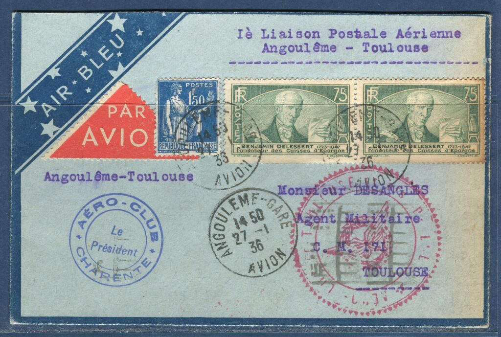 Porte étiquette triangulaire rouge PAR AVION + cachet de l'AERO CLUB de Toulouse - cachet à date ANGOULEME GARE AVION 27/1 - Affranchissement à 3 F : paire 75c Delessert ( 303 ) + 1 F50 type Paix bleu n° 288 -