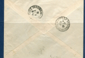 5 août 1935 - " PREMIERE LIAISON POSTALE ESTIVALE AERIENNE LA BAULE à PARIS, via Nantes - Muller n° 38 - PORTE GRIFFE SPECIALE DU VOL + cachet du camp d'aviation, grand cadre bleu, des " Ateliers et Chantiers de la Loire, Aérodrome Maurice Morin " + tampon rond 39 mm de " l'Aero Club de l'Atlantique, section de la presqu'ile Guérandaise " - Porte étiquette rouge triangulaire par avion - Cachet départ La Baule 5/8. Au dos : cachet d'arrivée à NANTES R.P. même jour. Affranchissement à 3 francs :