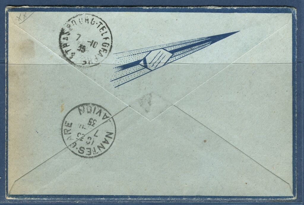 7 octobre 1935 - VOL direct NANTES à STRASBOURG - Pli enveloppe officielle d' AIR BLEU, papier bleu avec décors et logo de la Cie -