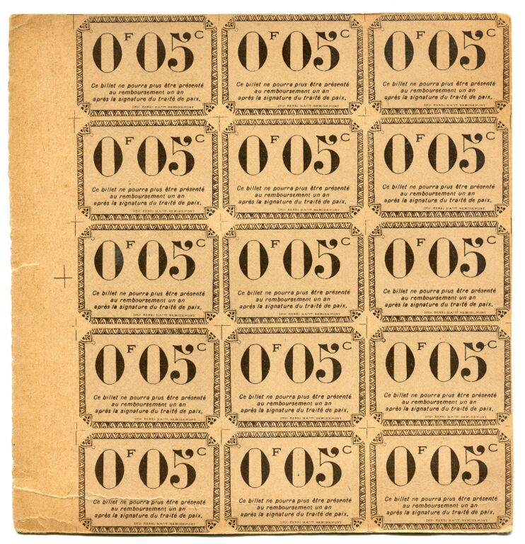 1ère Guerre Mondiale - VILLE de REMIREMONT / Vosges - 5c sur carton BILLET de NECESSITE, délibération du 19 juin 1917 - RARE BLOC de QUINZE billets non découpés, bord de feuille d'impression. Neufs, petit défaut, petit pli bas gauche.
