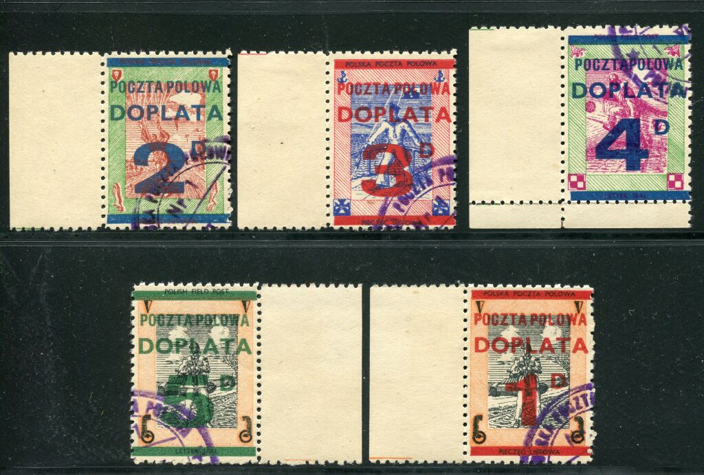 2e Guerre Mondiale - FORCES POLONAISES en EXIL à LONDRES - TIMBRES TAXES des POSTES de CAMPAGNE - Timbres de 1942 avec surcharges " DOPLATA 1 penny , 2p, 3p, 4p, 5p - série complète des 5 timbres émis :parachutiste, aviateur, marin, conducteur de char. Catalogue SMITH numéros 14 à 18.