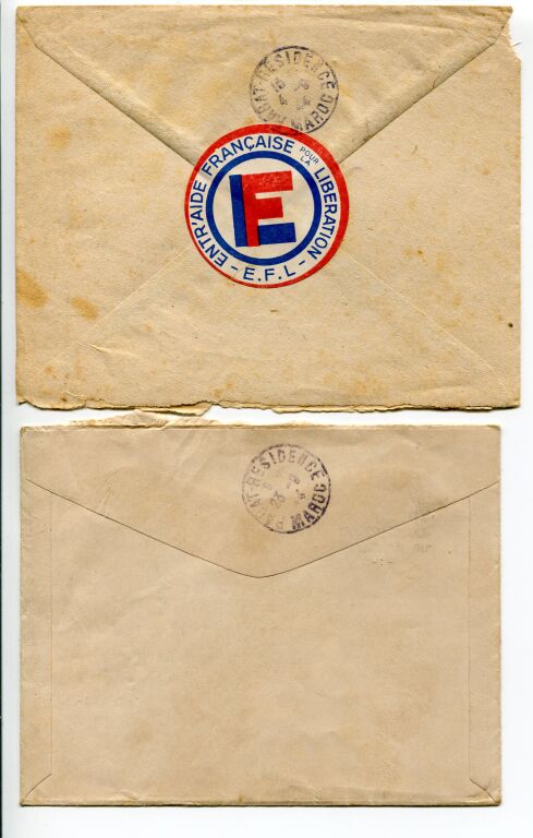 - Affranchissement 4 F 50 olive Marianne d' Alger n° 217 " postes Algérie ", employé seul, cachet a date ALGER-GARE 30 août 1944. - à noter mention " par avion " dessinée à la plume faute d' étiquette suite pénurie papier. - AU VERSO : pli de fermeture, étiquette ronde bleu-blanc-rouge 50 mm de " l' ENTR ' AIDE FRANCAISE pour la LIBERATION E.F.L. " et cachet d' arrivée Rabat Résidence 4 septembre 1944.