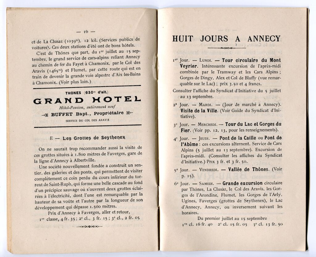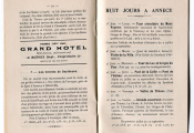 Descriptifs et plans des trajets, renseignements pratiques : le tour du lac en bateau à vapeur, promenade dans la vallée de Thônes en tramway à vapeur, les hôtels à Annecy (7 hôtels seulement...), les environs, un programme pour 8 jours à Annecy. Descriptifs des curiosités, les routes alentours, publicités...