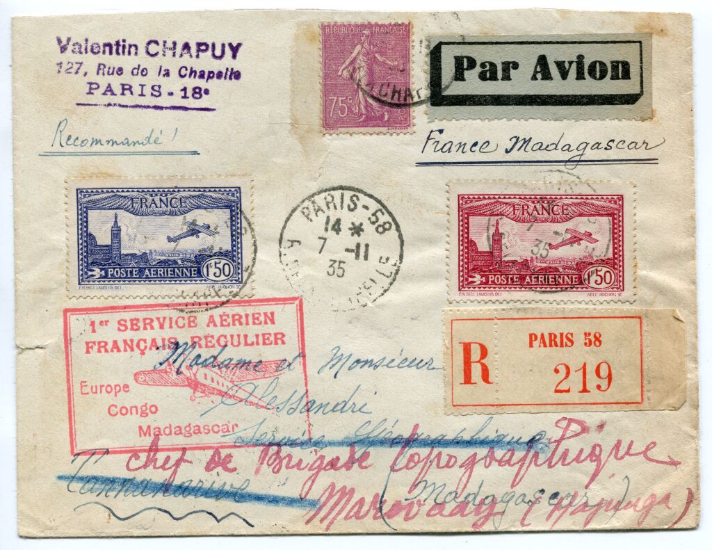 au départ de Paris 58 7 novembre 1935 - au dos arrivée à Tananarive RP 17 novembre.