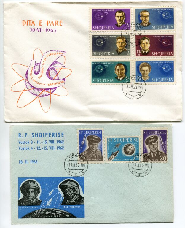 - 1er vol spatial groupé Vostok 3 et vostok 4 du 11 au 15 août 1962, engins en vol autour de la Terre et portraits des cosmonautes Nikolaiïev et Popovitch. série 611 à 613.