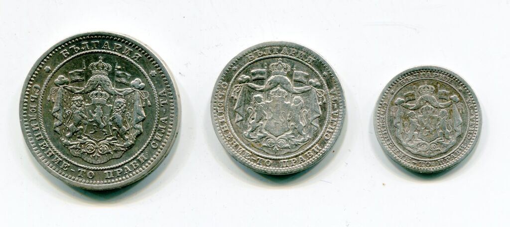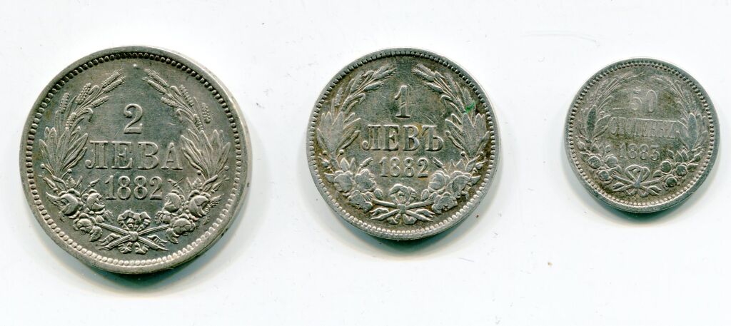 ARGENT - BULGARIE / UNION LATINE - ALEXANDRE 1er PRINCE sous la souveraineté turque - Collection des 3 monnaies armes princières sous un dai couronné soutenues par 2 lions : 50 stotinki 1883 TTB/SUP + un Lev 1882 TTB + 2 Leva 1882 SUP