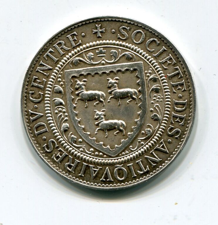 ARGENT - JETON de la SOCIETE des ANTIQVAIRES du CENTRE ( * ) - armoiries de la ville de Bourges (d'azur à 3 moutons d'argent accornés...) entourées des inscriptions, croix à midi - Revers : FONDEE A BOVRGES EN MDCCCLXVII (1867), décor en centre sur 2 axes d'arabesques et feuilles, coupe antique à midi.