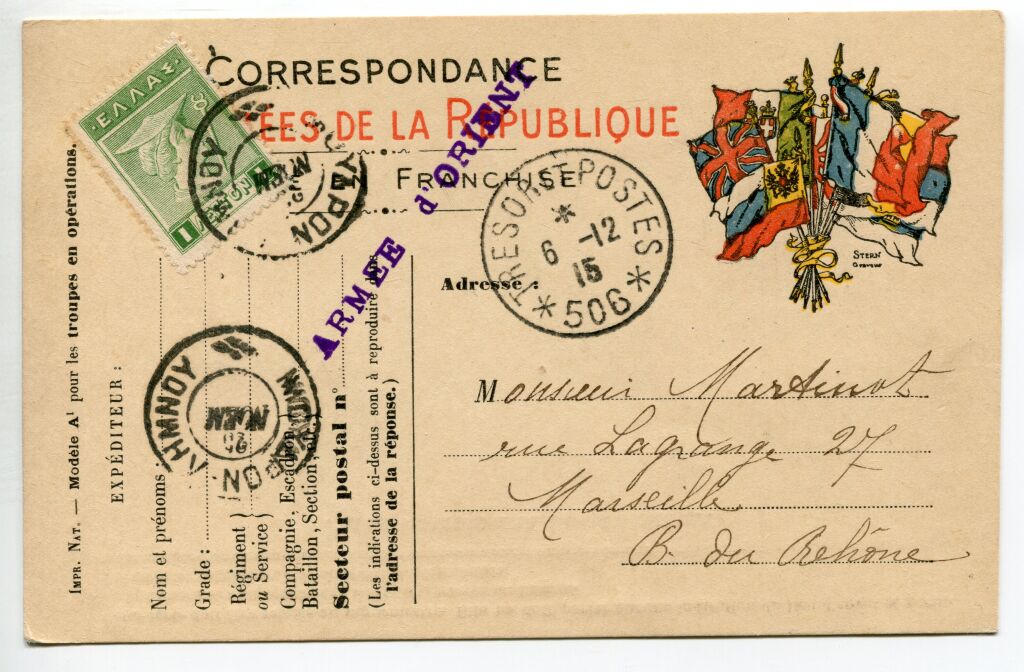 ARMEE D'ORIENT 1ère guerre mondiale - POSTE MILITAIRE FRANCAISE de la base de MOUDROS (armée française en GRECE) - carte postale de Franchise Militaire "des armées de la République", type au drapeau, envoyée par un soldat français à Marseille. Joli document portant griffe, frappe en violet, linéaire ARMEE D'ORIENT et cachet à date TRESOR et POSTES 6 décembre 1915, secteur postal 506 (rare cachet).