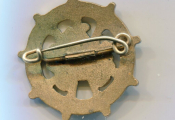 Rond 30 mm, émail grand feu en forme de roue émail vert à écritures dorées. En centre, sur les rayons dorés, ancêtre automobile portant drapeau émail bleu et rouge de la ville de Clermont Fd ; sur le châssis de l'auto millésime 1900. Épinglette au dos.