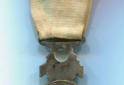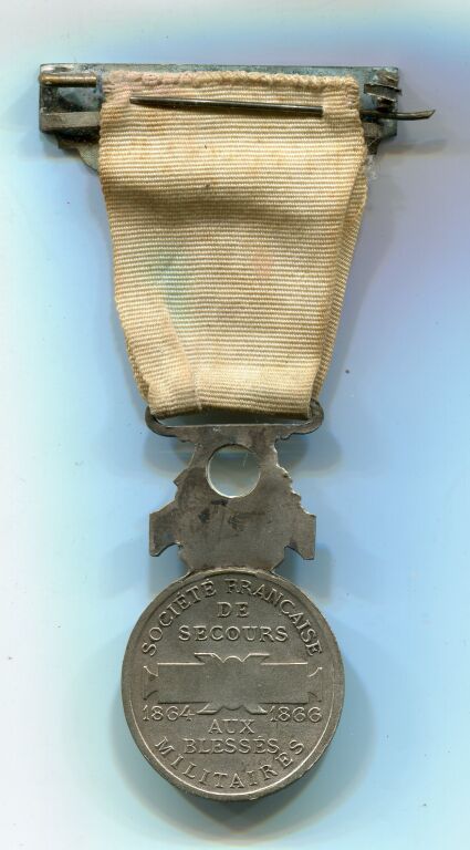 GUERRE de 1870 - 1871 - Médaillon ovale 48 x 25 mm avec bélière mention S.B., allégorie de la France portant secours à un cuirassé blessé mention " Patrie Dévouement " - au dos texte : " Société Française de Secours aux blessés militaires 1864-1866". Ruban blanc avec, brodée, grosse croix rouge en centre. Agrafe sur le ruban avec texte en rouge et gris : "CROIX ROUGE société française de secours aux blessés militaires 1864 ".