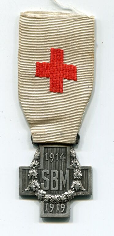 PREMIERE GUERRE MONDIALE mention 1914 / 1919 - Croix avec mentions SBM / 1914 et 1919, couronne de feuilles de chêne et laurier sur la croix - Ruban blanc, croix rouge brodée en centre. Au dos rayures verticales sur la croix légende : "société française de secours aux blessés militaires des armées de terre et de mer".