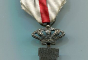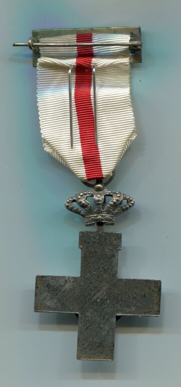 Modèle monoface, médaillon émail grand feu 60 x 40 mm ; croix grecque à branches surmontée d'une couronne argent sur lesquelles figure en centre une pastille rajoutée en émail rouge et blanc, filets argent, le blason d'Espagne. -