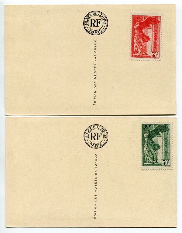 FRANCE 1937 - Paire VICTOIRE de SAMOTHRACE, n° 354 et 355. Chacun des timbres collé sur une carte postale des Musées Nationaux / Musée du Louvre (comme vendus à l'époque) formant carte maximum ( vues : Raphaël la Belle Jardinière + Vénus de Milo, Aphrodite à demi nue). - Timbres neufs