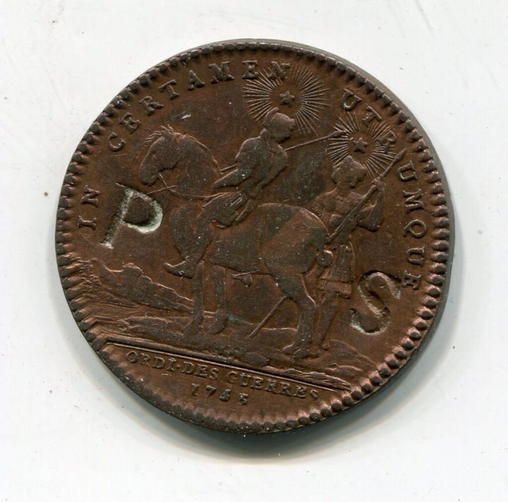 LUD.XV.REX.CHRISTIANISS buste à droite signé D (Duvivier), variante de signature non répertoriée dans le Feuardent - Revers : IN CERTAMEN UTRUMQUE, cavalier et fantassin, à l'exergue : "ORDI DES GUERRES 1753".