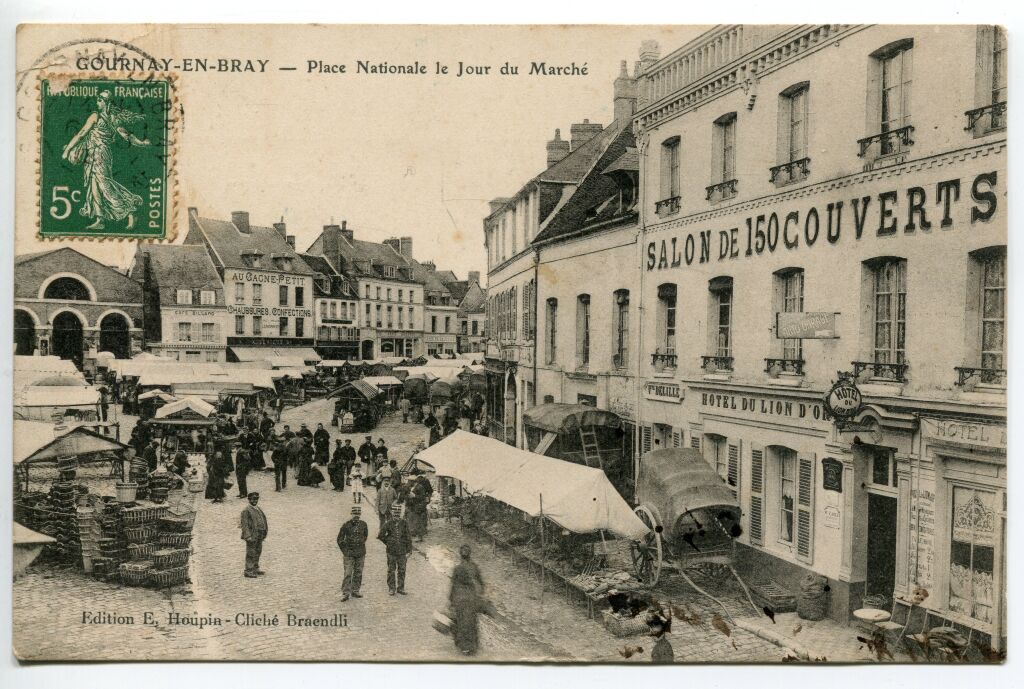GOURNAY en BRAY (76) - carte postale, " PLACE NATIONALE LE JOUR DU MARCHE ", très animé marchands de volailles avec leurs grands paniers, au fond les halles et AU GAGNE PETIT chaussures ; à droite gros plan de L' HOTEL du LION D' OR. Houpin phot