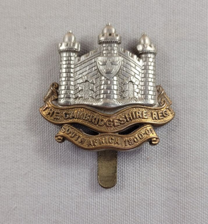 GRANDE BRETAGNE 1900 / 1914 - RARE INSIGNE de CASQUETTE de " THE CAMBRIDGESHIRE REGIMENT " avec banderole " SOUTH AFRICA 1900-01 ".