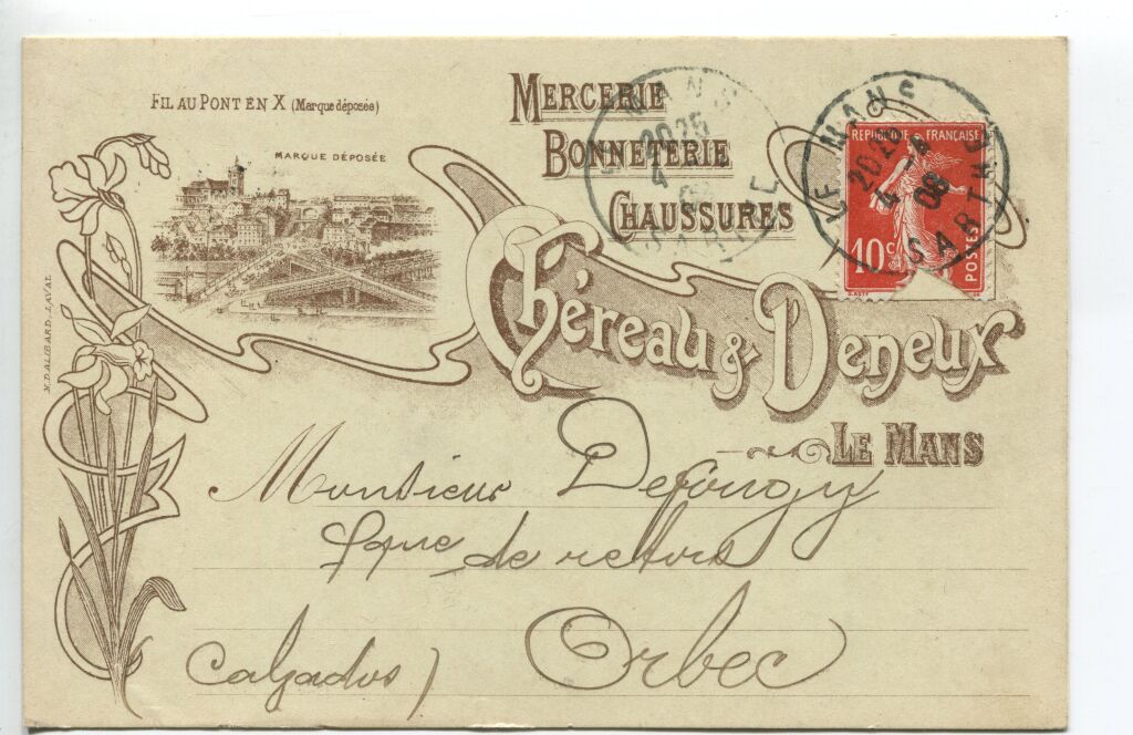 LE MANS (72) - carte postale publicitaire correspondance de CHEREAU & DENEUX MERCERIE-BONNETERIE-CHAUSSURES " FIL au PONT en x ". - 1908.