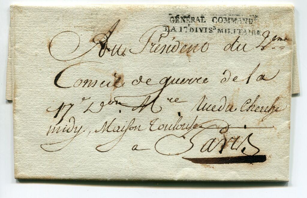 Griffe frappe en noir, 2 lignes en capitales : " GENERAL COMMANDANT / LA 17e DIVISn MILITAIRE " 6 x 39 mm - Sénéchal n° 1296