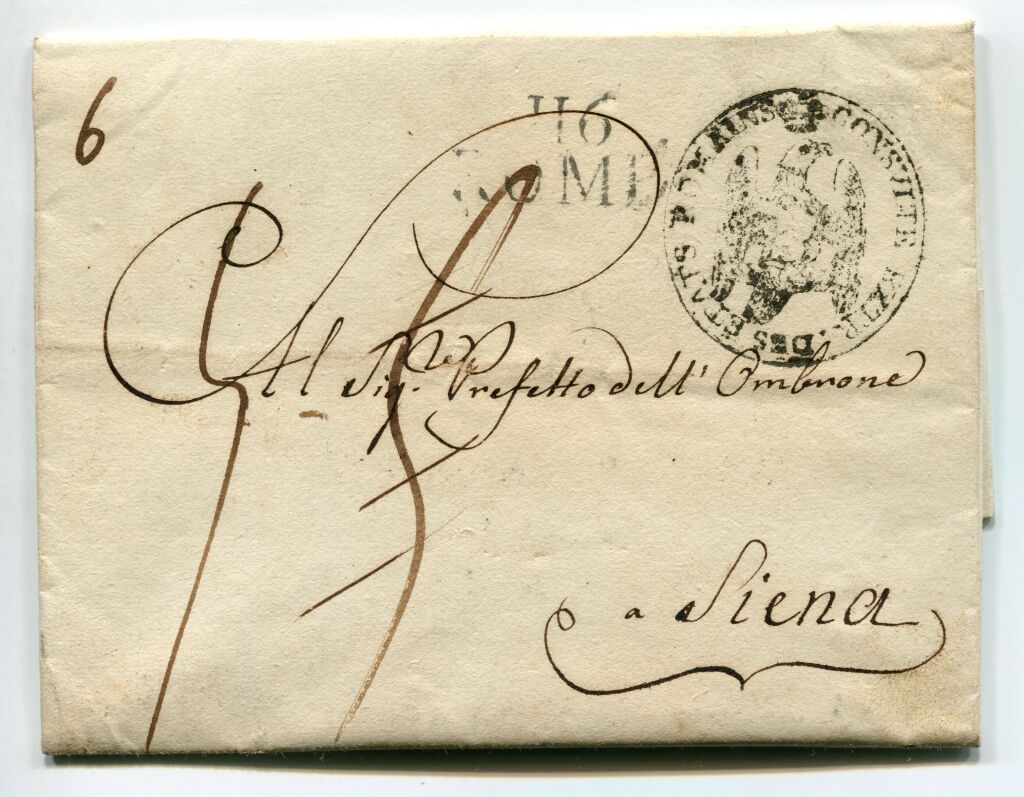 Belle lettre en port payé au départ de Rome le 4 octobre 1810 pour Sienne. Porte au recto marque postale du département 116 ROME ( VATICAN Italie ) + cachet à l'aigle couronné du service expéditeur : Conseil extraordinaire des États Romains -