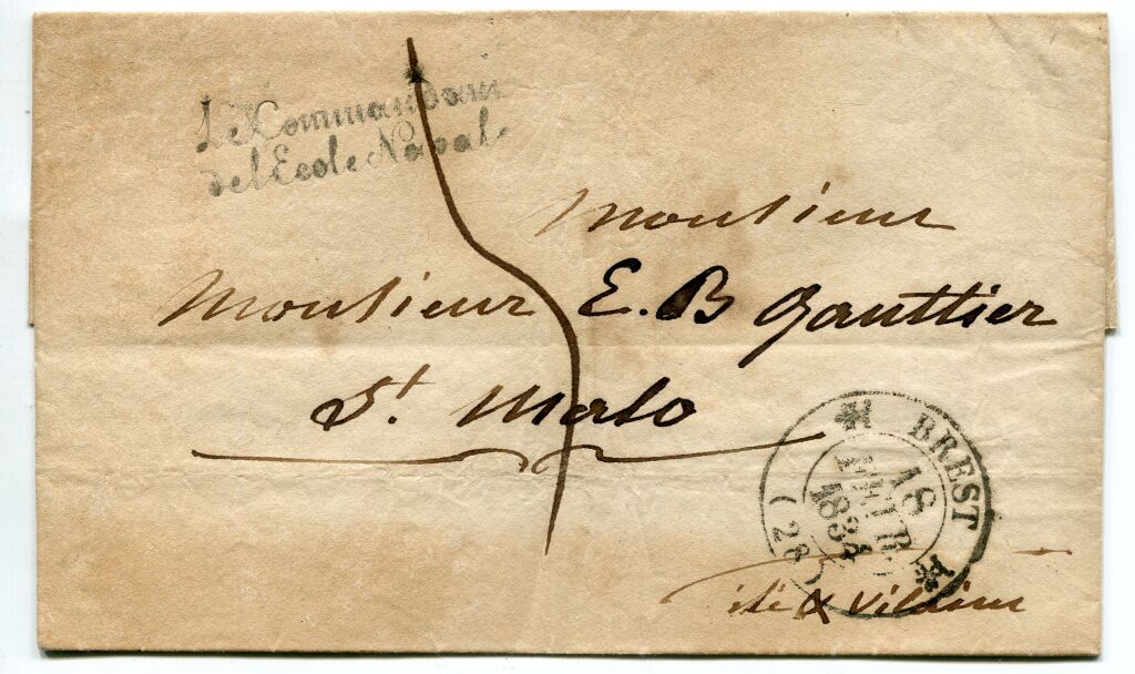 MARCOPHILIE - LOUIS PHILIPPE - MARINE NATIONALE - Lettre en port dû au départ de BREST pour St Malo - PORTE GRIFFE, en cursives sur deux ligne : " LE COMMANDANT / de L' ECOLE NAVALE " - cachet à date simples fleurons au type douze, 18 février 1834 - au dos réception St Malo 19 février.