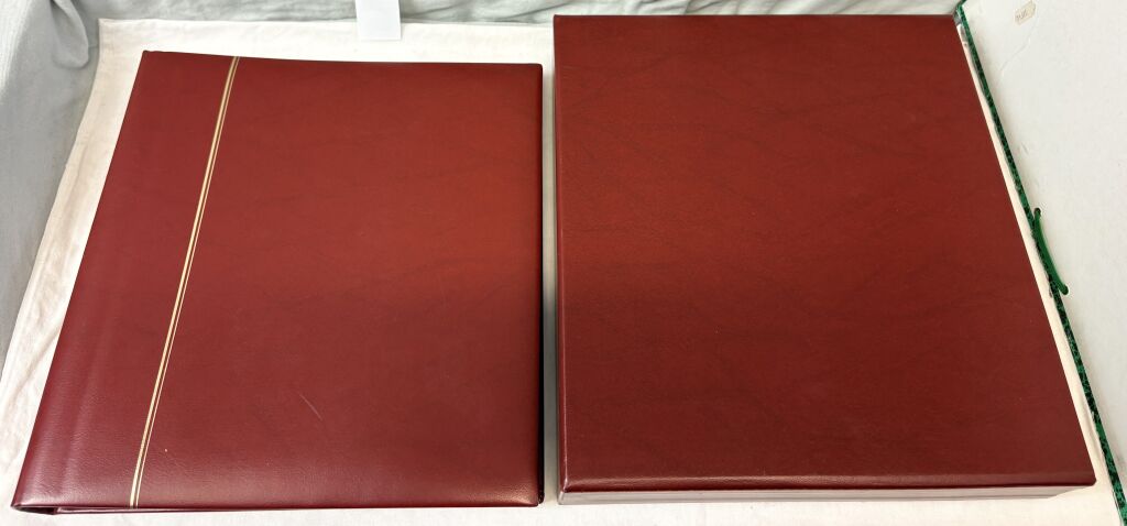 MATERIEL - ALBUM SAFE pour TIMBRES et documents - Reliure mobile à 14 anneaux rouge de type favorite revêtement Skaï (référence gamme luxe 807) rouge avec son boitier assorti - Contient 50 pages (25 feuilles) différentes hauteurs de bandes, feuilles de type ' Garant " (gamme 700) à bandes transparentes soudées sur support rigide noir.
