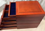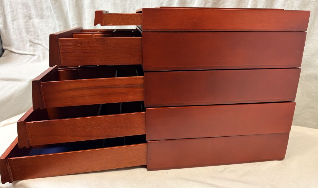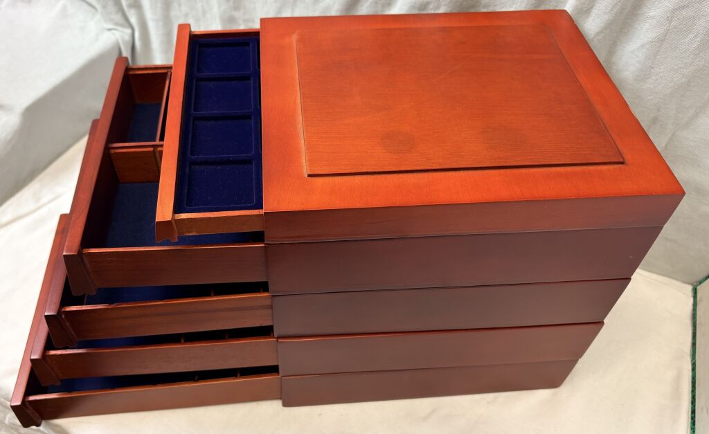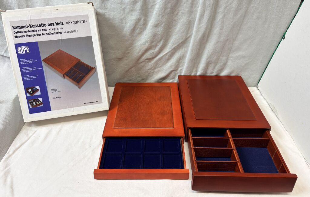 MATERIEL - Ensemble de cinq Box / tiroirs en bois de marque SAFE : un box pour les monnaies + quatre box pour petits objets en volume telles montres, tabatières, objets sculptés, bijoux etc…