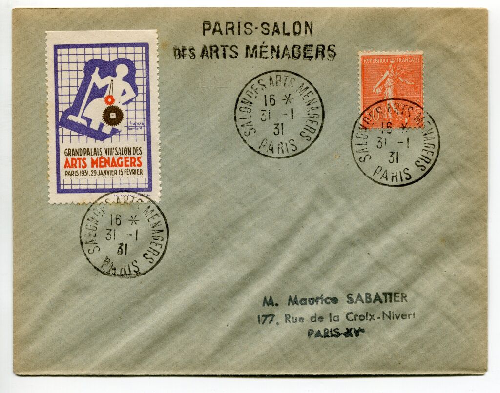 PARIS (75) - 31 janvier 1931 - SALON des ARTS MENAGERS - Lettre avec timbre 50c rouge semeuse lignée n° 199 OBLITERATION TEMPORAIRE du bureau de poste spécial de la manifestation - Porte également griffe linaire 2 lignes du même bureau : " PARIS - SALON / des ARTS MENAGERS " et vignette dentelée 53 x 35 mm de propagande postale, reprise de l'affiche de la manifestation, dessin d'une ménagère et balais mécanique de l'illustrateur Francis Bernard "Grand Palais VIIIe salon des arts ménagers Paris 1931- 29 janvier/15février.