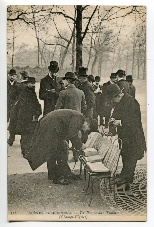 PARIS (75) - " CHAMPS ELYSEES - LA BOURSE AUX TIMBRES ", 1905, carte postale collection "Scènes Parisiennes" ND 722 - Gros plan d'un vendeur du coté des "pieds humides", albums exposés sur des chaises ; public d'hommes en redingotes et chapeaux.