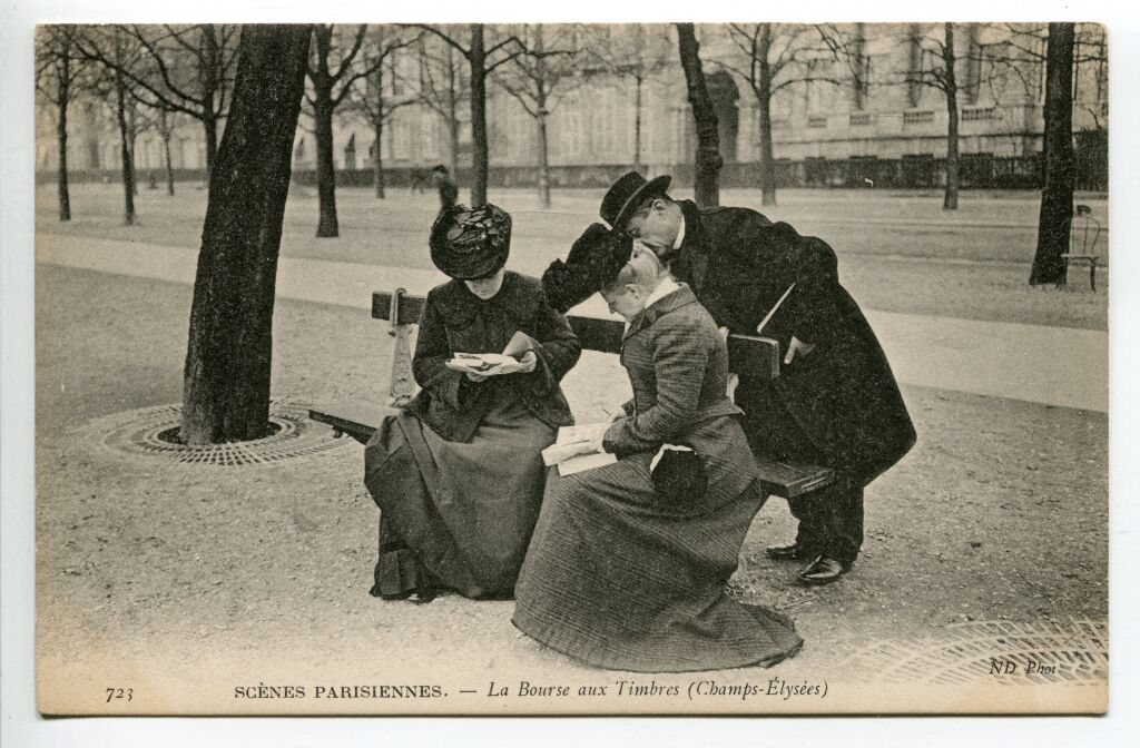 PARIS (75) - " CHAMPS ELYSEES - LA BOURSE AUX TIMBRES ", 1905, carte postale collection "Scènes Parisiennes" ND 723 - Gros plan de 2 femmes assises sur un banc regardant un album et catalogue sous le regard d'un homme debout.