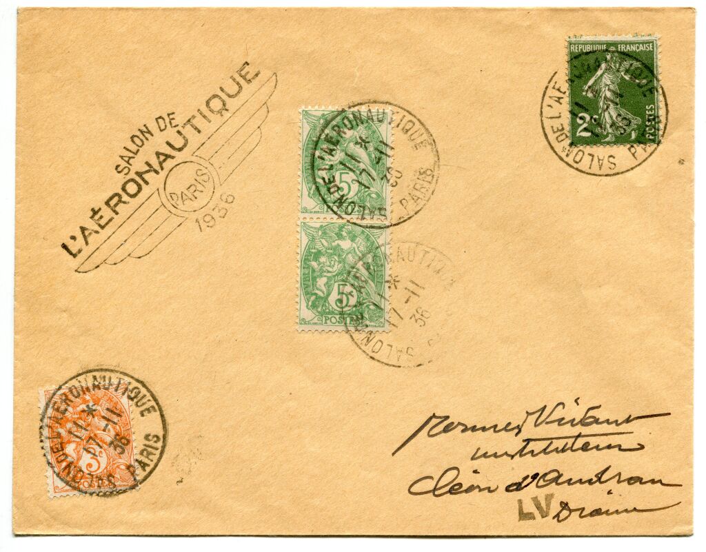 PARIS SALON de L' AERONAUTIQUE 1936 (du 13 au 29 novembre).Lettre au départ de Paris pour la Drôme. Cachet à date spécial temporaire du " SALON de L'AERONAUTIQUE 17 novembre" + GRANDE GRIFFE de la manifestation, frappe en noir, en forme d'aile.