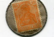 RARE TIMBRE MONNAIE 1922 sous capsule en fer nickelé 33,8 mm - ALLEMAGNE, timbre à 10 Pfennig orange au type Germania sur fond gris - au verso, par estampage logo de " RHEINSTAHL ", ( * ) dans un triangle lettrage marteaux de mineur croisés sous un aigle stylisé ailes déployées - état neuf sans aucune oxydation.