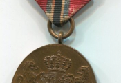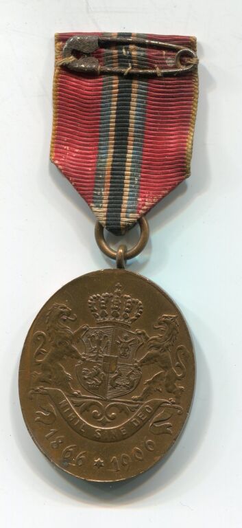 bronze, ovale 38 x 31 mm, portrait du roi profil à gauche - revers : armes royales couronnées soutenues par 2 lions " NIHIL SINE DEO ". - Ruban rouge, 2 liserés jaune à droite et à gauche, 3 liserés bleu / noir / bleu en centre.