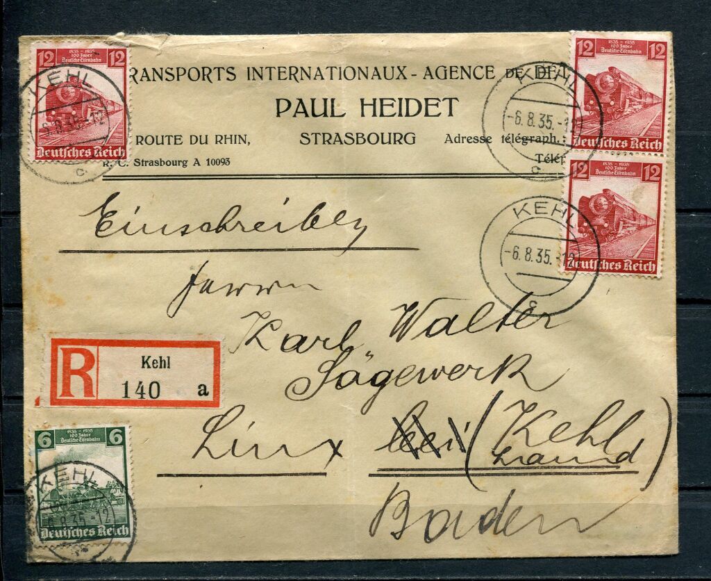 STRASBOURG / KHEL - Lettre recommandée au départ de Kehl le 6 août 1935 à entête des Transports Internationaux - agence de détaxes - Paul HEIDET, 180 route du Rhin à Strasbourg. - CHEMINS de FER : très bel affranchissement timbres de l' Allemagne Reich " centenaire des chemins de fer allemands " trois 12 Pf locomotive vapeur + 6 Pf locomotive Adler.
