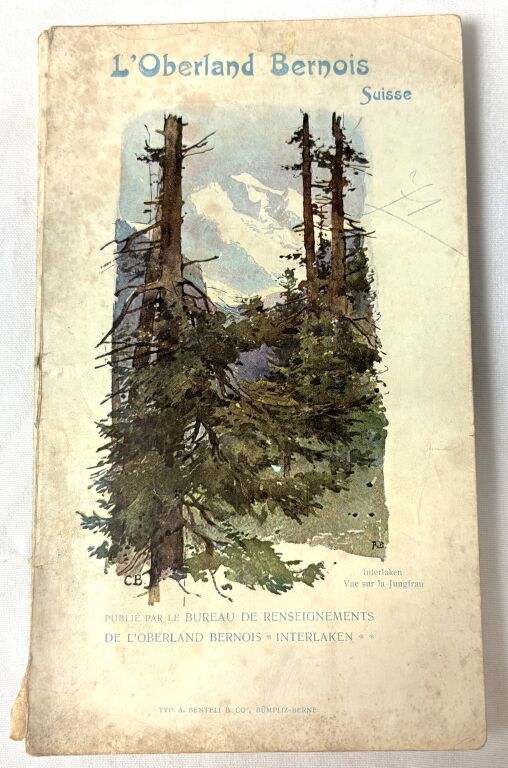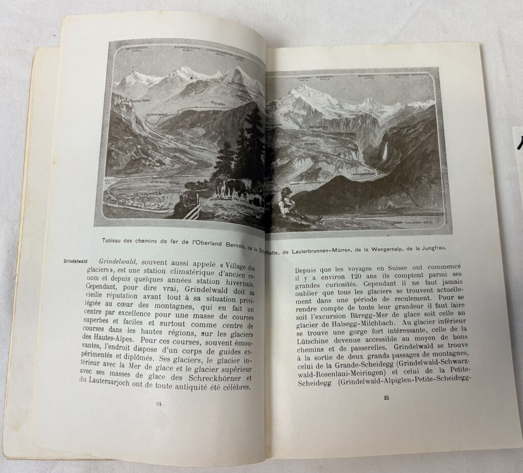 138 pages bien illustrées d'après les photographies de Wehli frères de Zurich et Hartmann d' Interlaken - Tous les sites touristiques et villages de montagne, les villes, les chemins de fer de montagne et généraux, les curiosités, les horaires des bateaux à vapeur sur les lacs de Thoune & Brienz etc...- complet de sa carte dépliante - 20,5 x 12 cm.