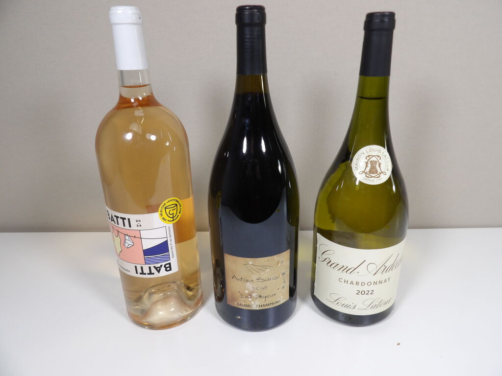 3 magnums : vin blanc Grand Ardèche Louis Latour 2022, vin rosé Batti domaine de la Galinière IGP Méditerranée 2024 et vin rouge Saumur Champigny Antoine Sanzay cuvée Les Poyeux 2018 (étiquette abîmée)
