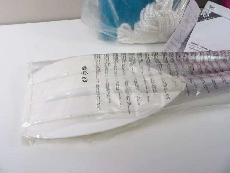 Bateau gonflable d'occasion LIDL, semble état correct, avec une palme.