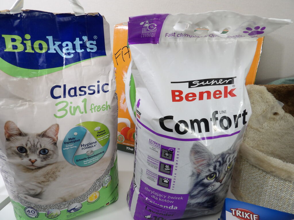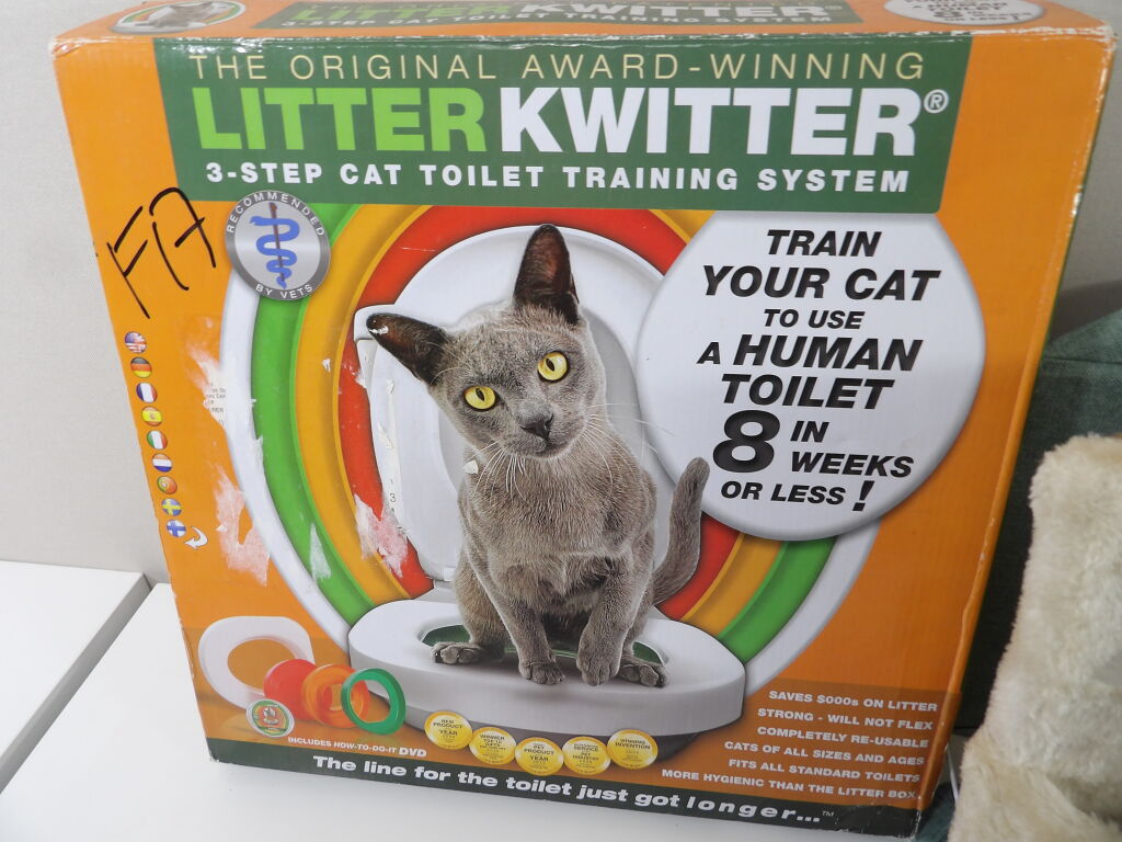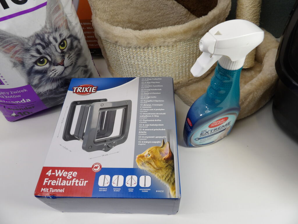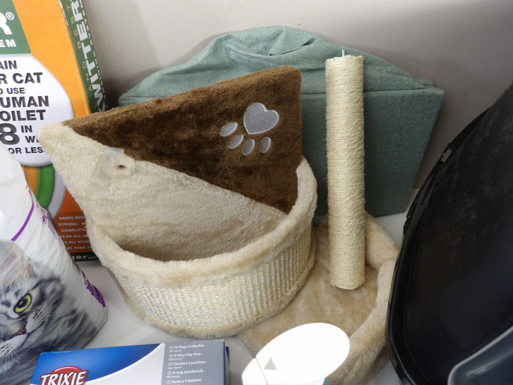 CHAT : Lot comprenant 6 articles neufs et occasion : Arbre à chat (attention manque la visserie), Chatière TRIXIE, x2 paquets de litière, Kit entrainement pour aller au WC et litière (attention la porte est cassée).