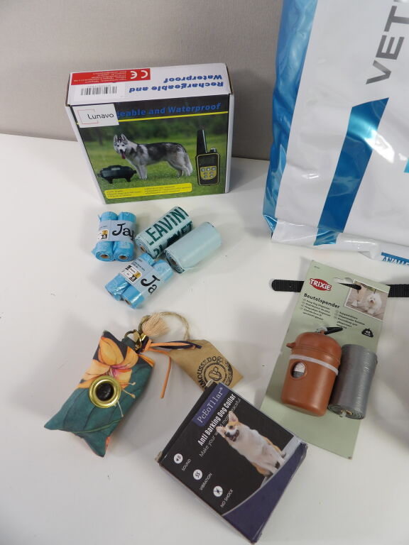 CHIEN : Lot comprenant 8 articles principalement neufs et occasion : Royal Canin Croquettes Anallergenic 8kgs, muselière, sacs a crottes et autres.