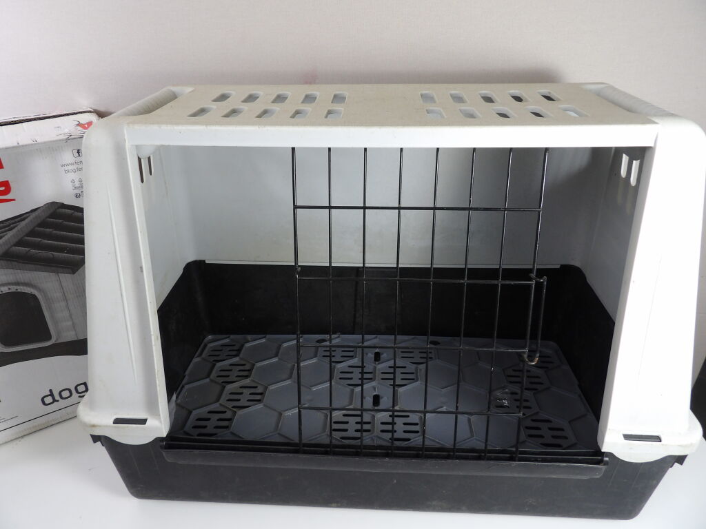 CHIEN : x2 Articles d'occasion vendus en l'état : cage de transport (grille fermeture incomplète?) et petite maison DOGVILLA (dimensions extérieure 43x48x44cm.